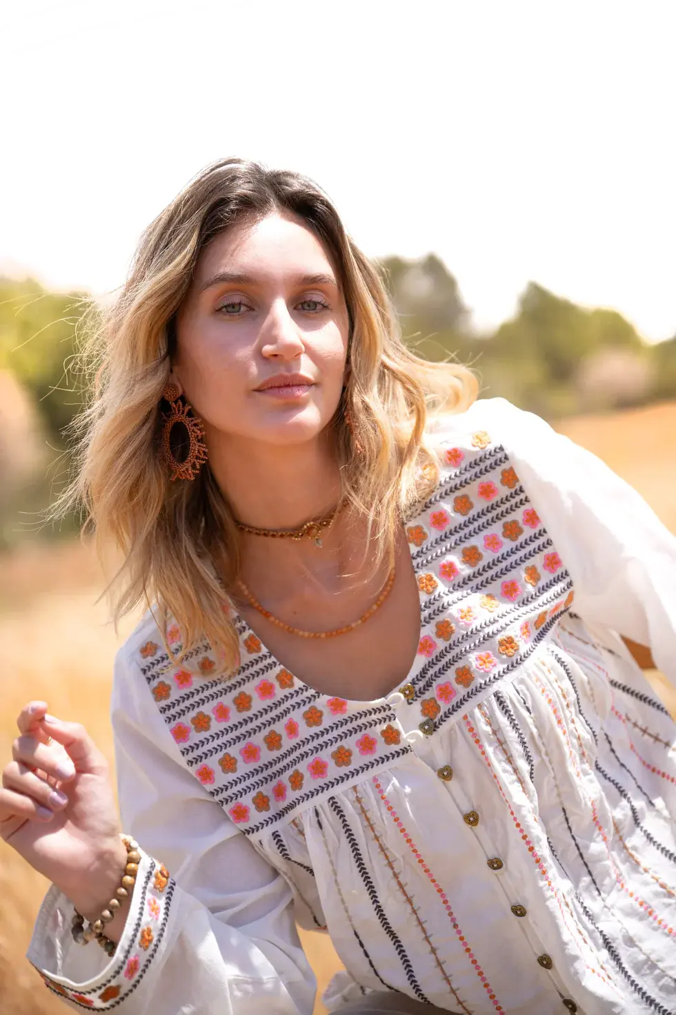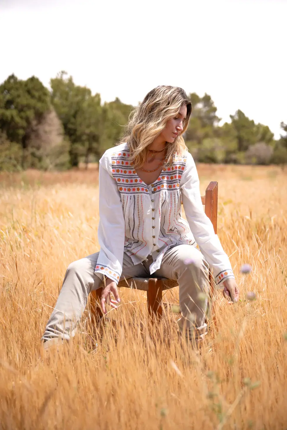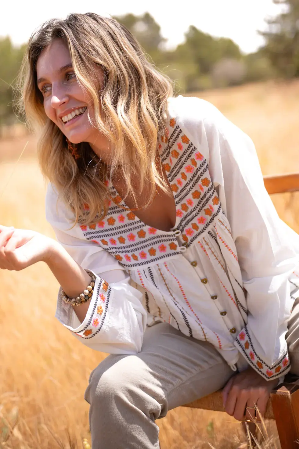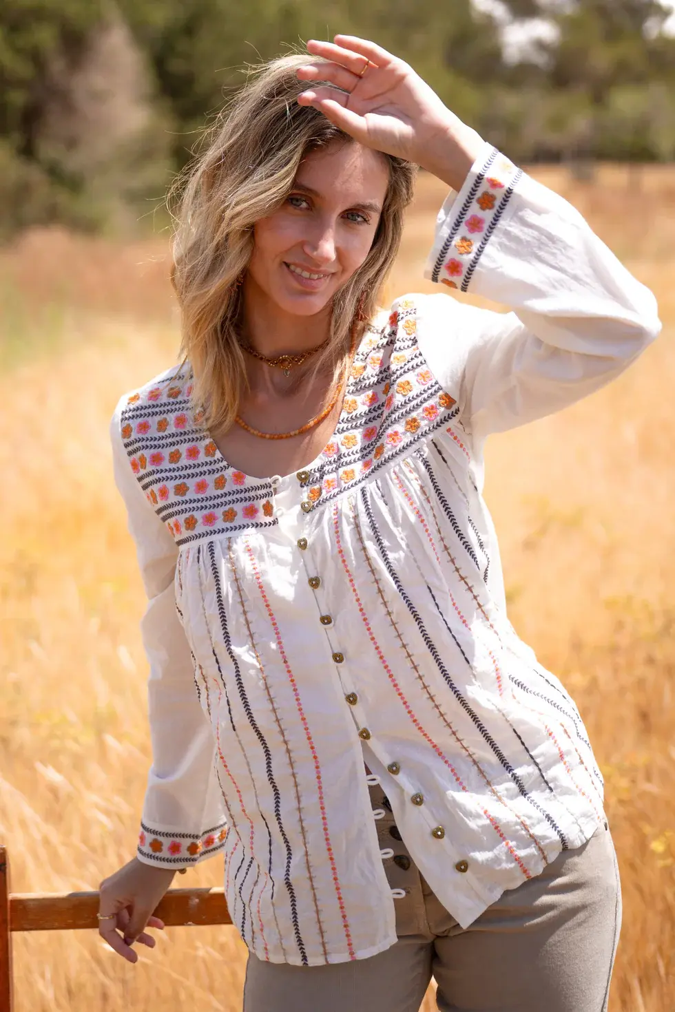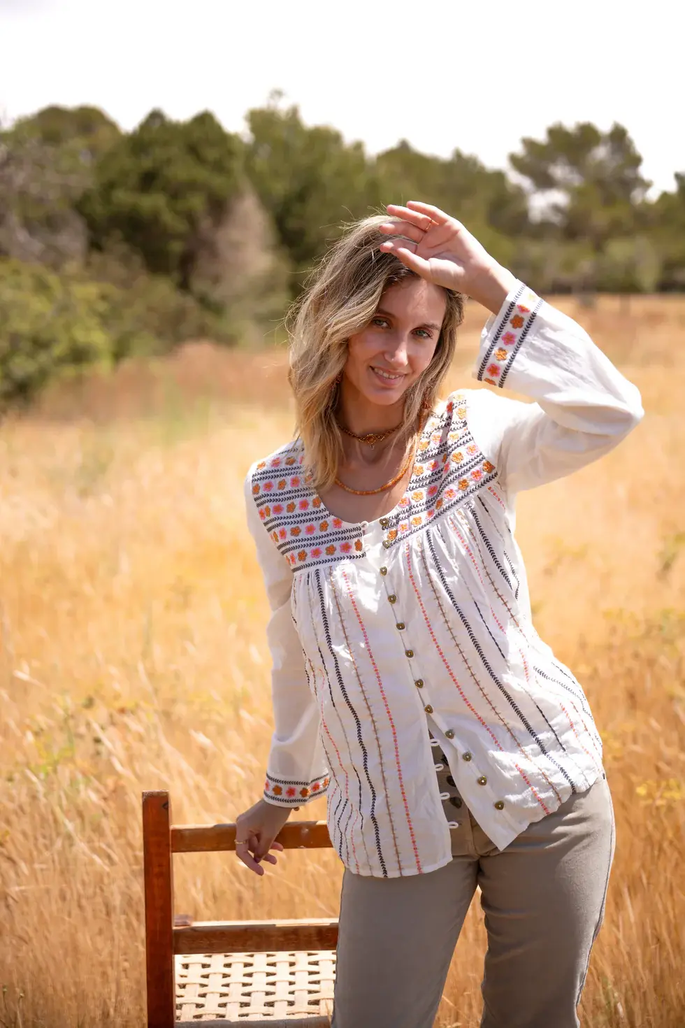 Blouse met ronde hals, sluit met de Isla Ibiza knoopjes, is rijkelijk geborduurd in verschillende kleuren, heeft licht uitlopende mouwen.