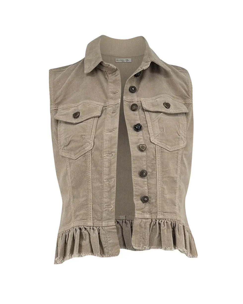 Gilet gemaakt van een zachte stof, heeft een kraagje, knoopjes en ruche onderrand.
