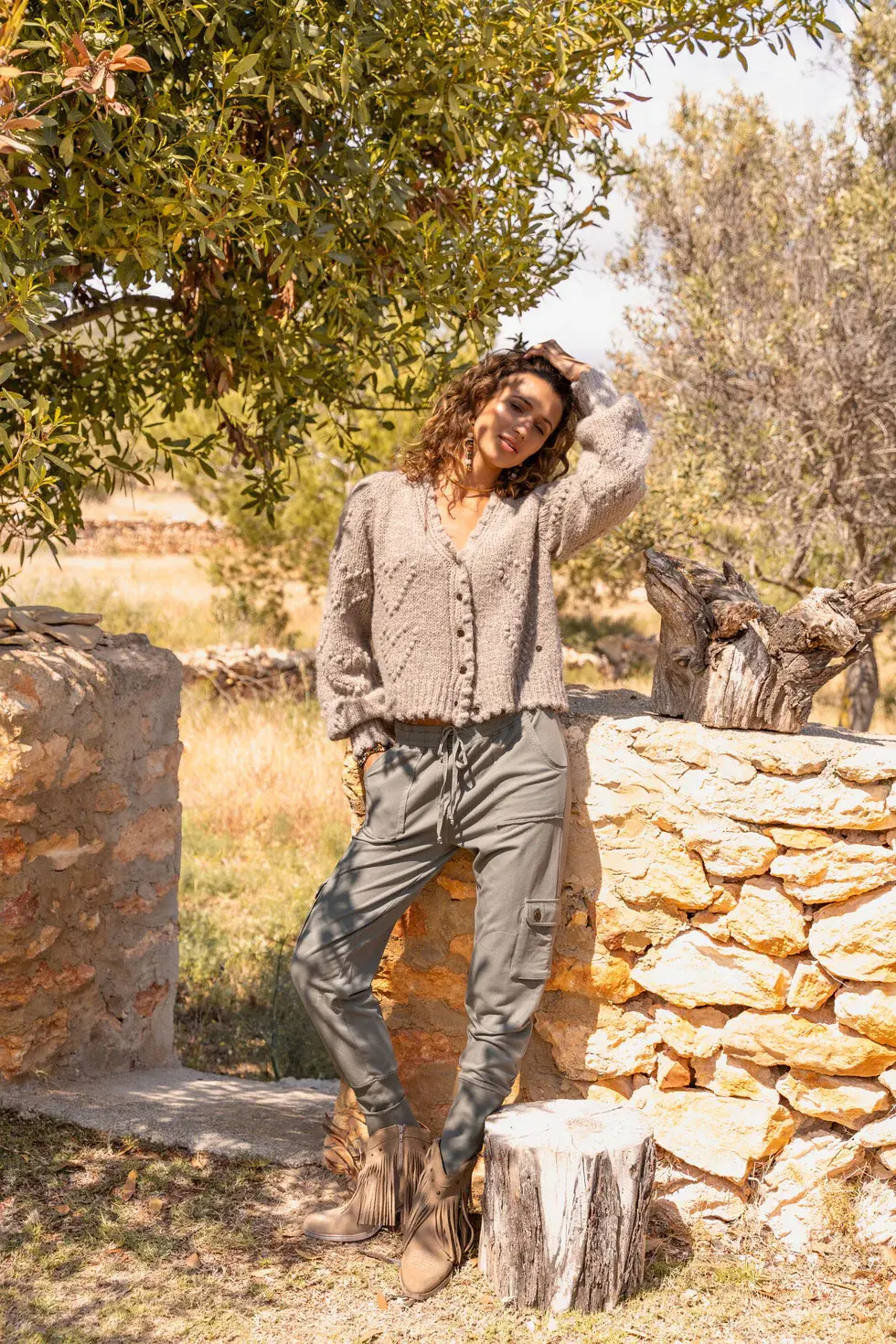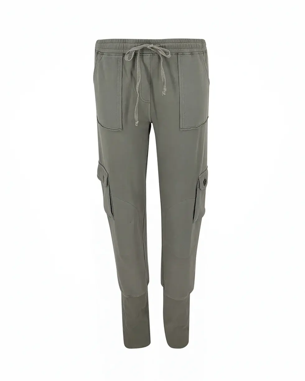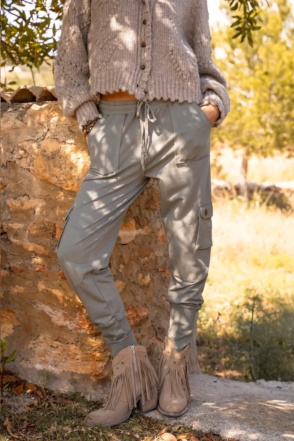 Comfy cargo broek, zakken, elastische band met aantrek koord, model valt smaller aan de onderkant.