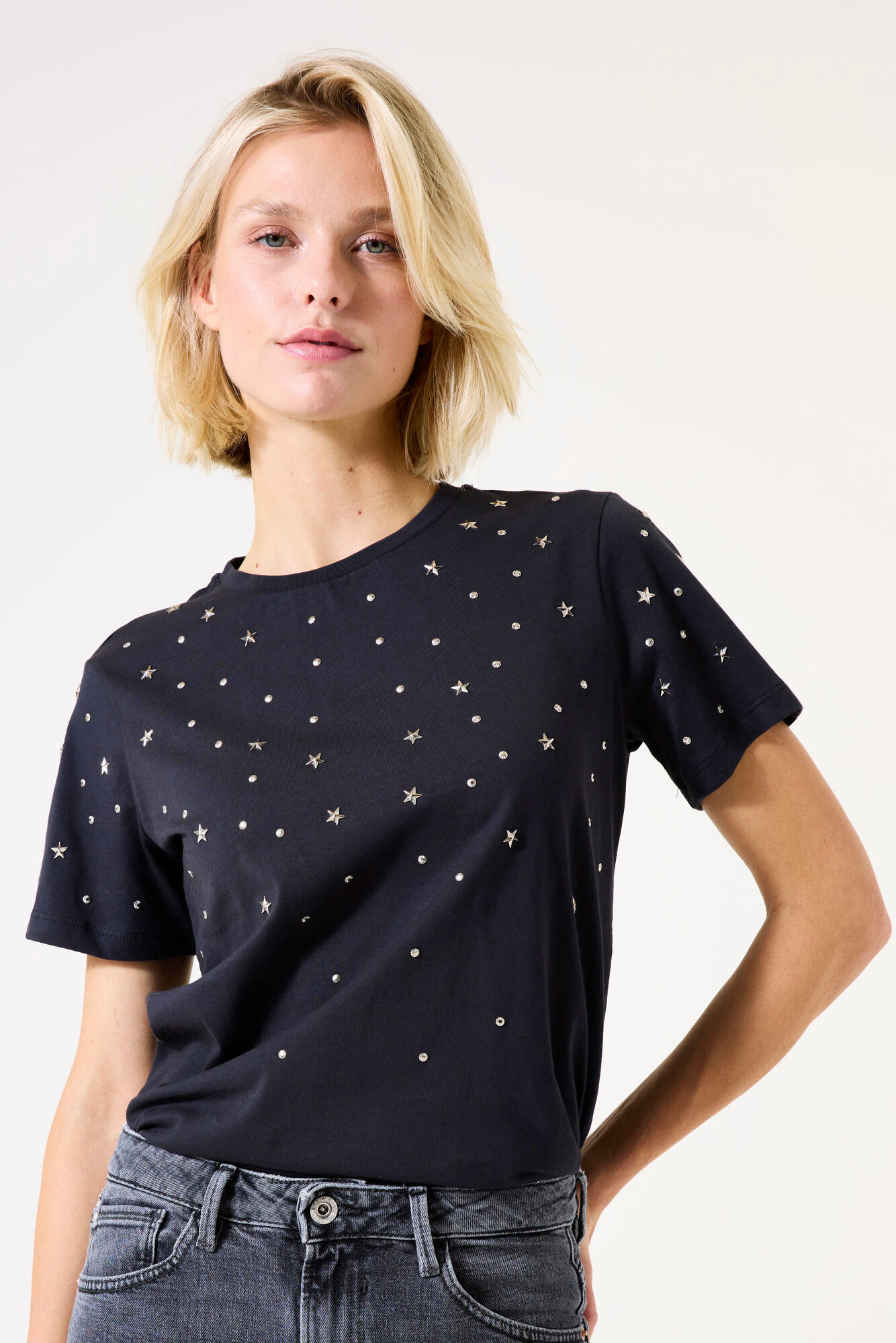 Stijlvol T-shirt met een speelse print. Dit T-shirt heeft een ronde hals, korte mouwen en een relaxed fit. Dit item is gemaakt van 100% katoen, wat zorgt voor een comfortabele en ademende draagervaring.