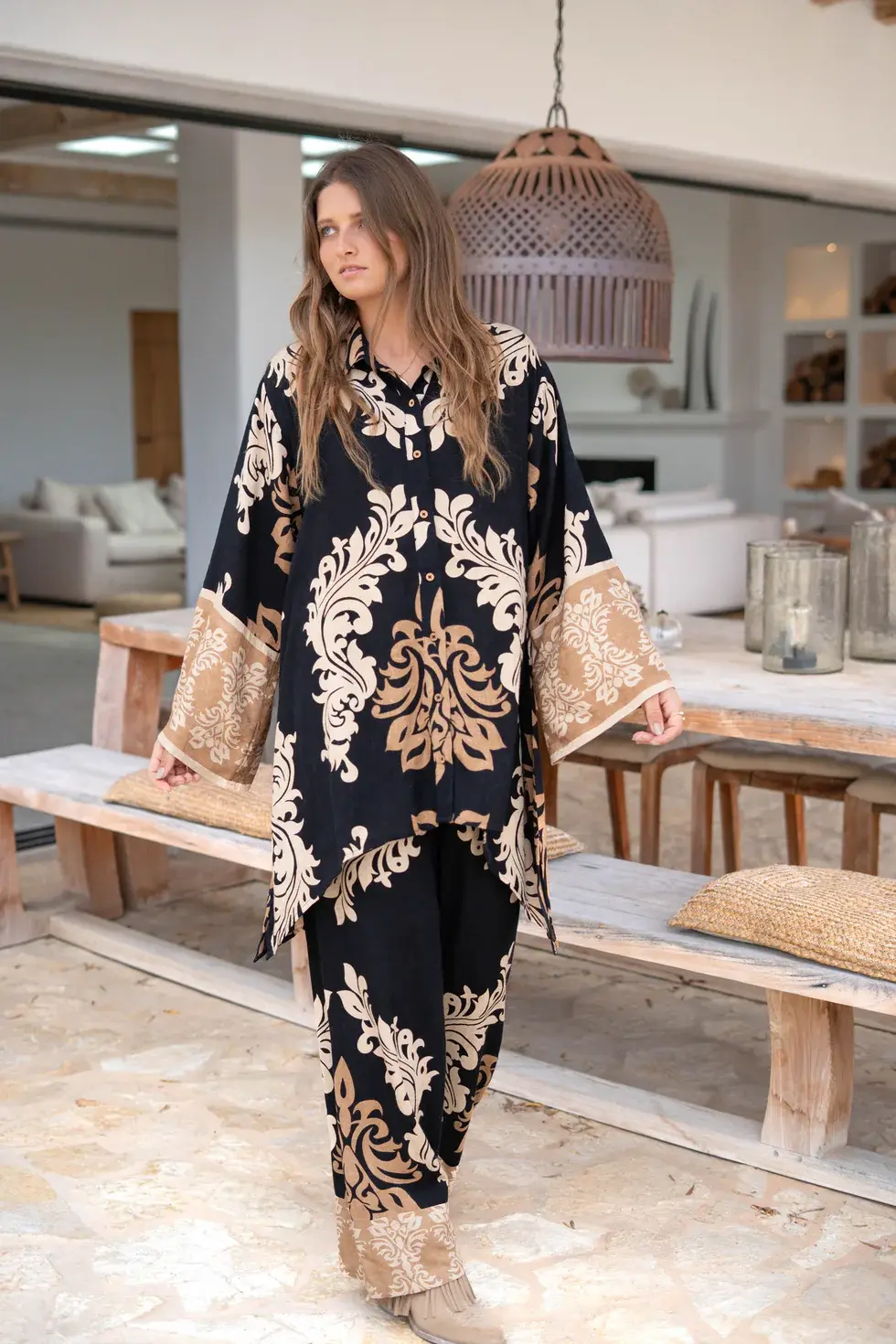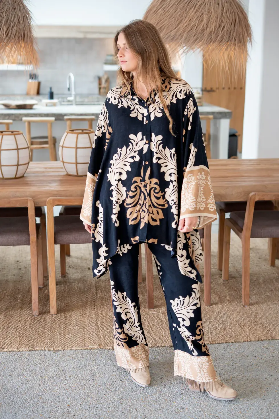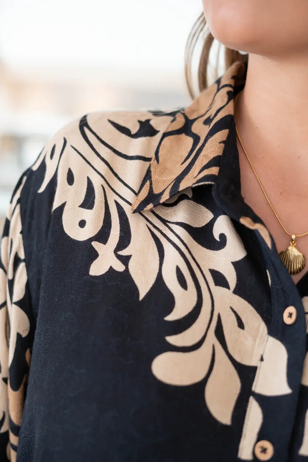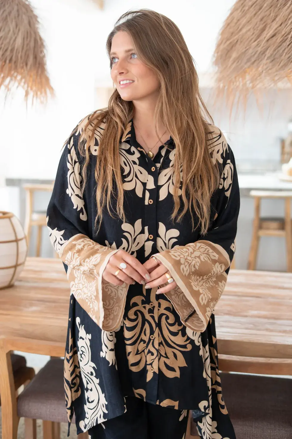 Lange blouse met puntige zijkanten, lange wijde mouwen, kraag en knoopsluiting.