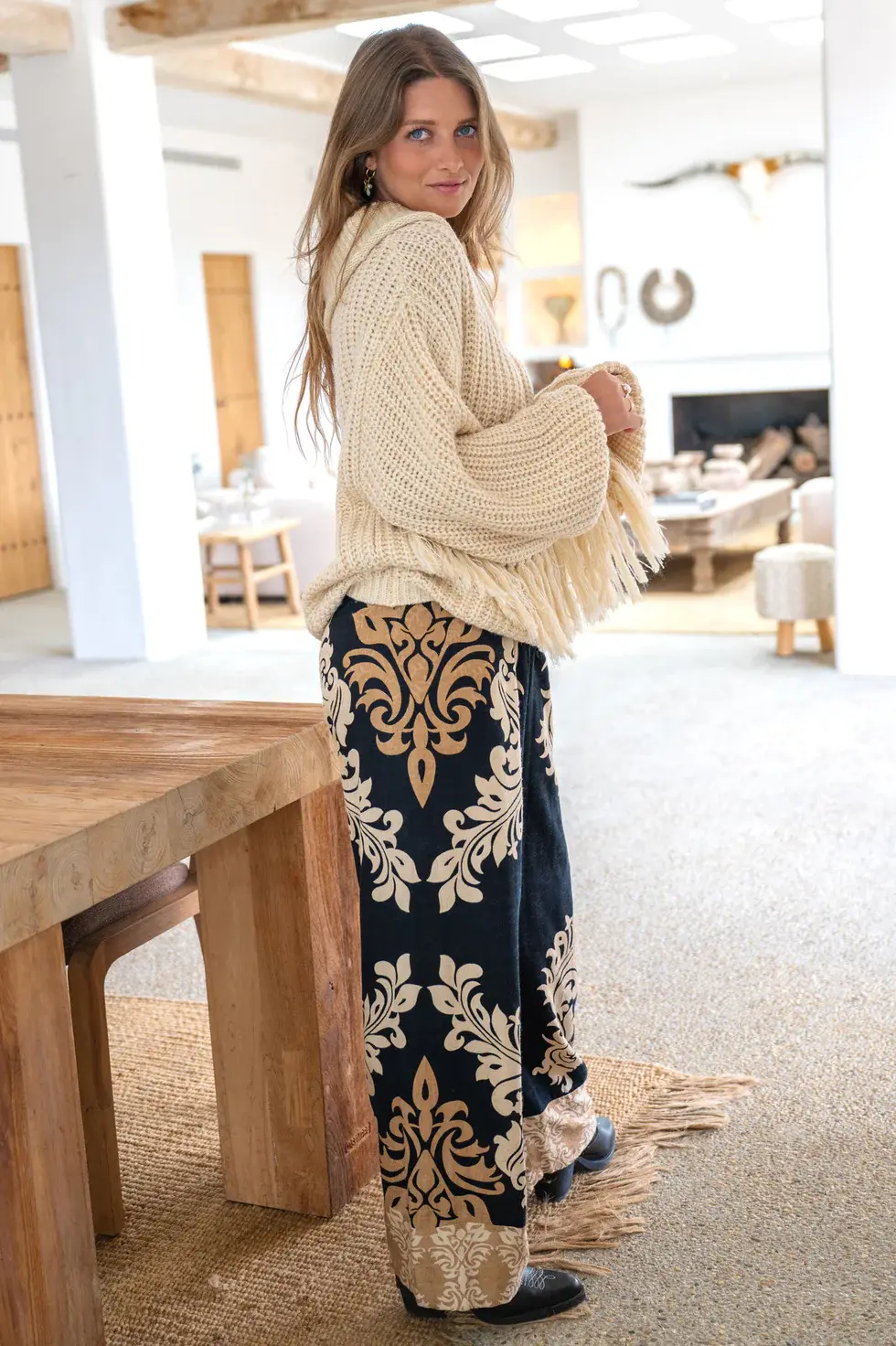 Pantalon met elastische band in de taille, heeft steekzakken en baroque dessin.