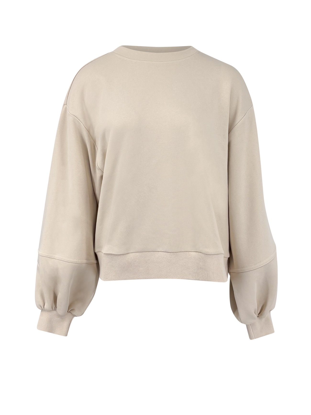 Heeft een ronde hals, heeft ballon mouwen, een gestikt detail op de mouwen.