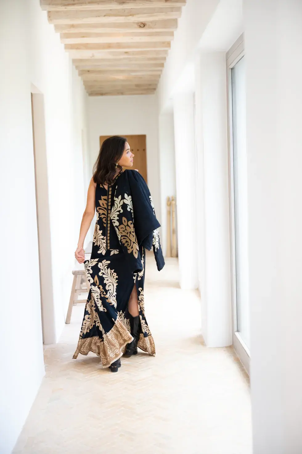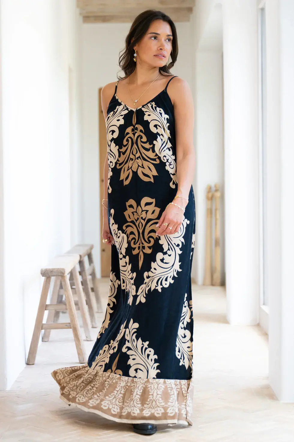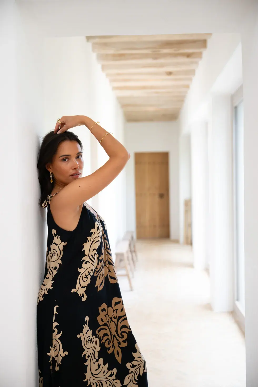 Lange jurk met dunne schouderbandjes en baroque dessin.