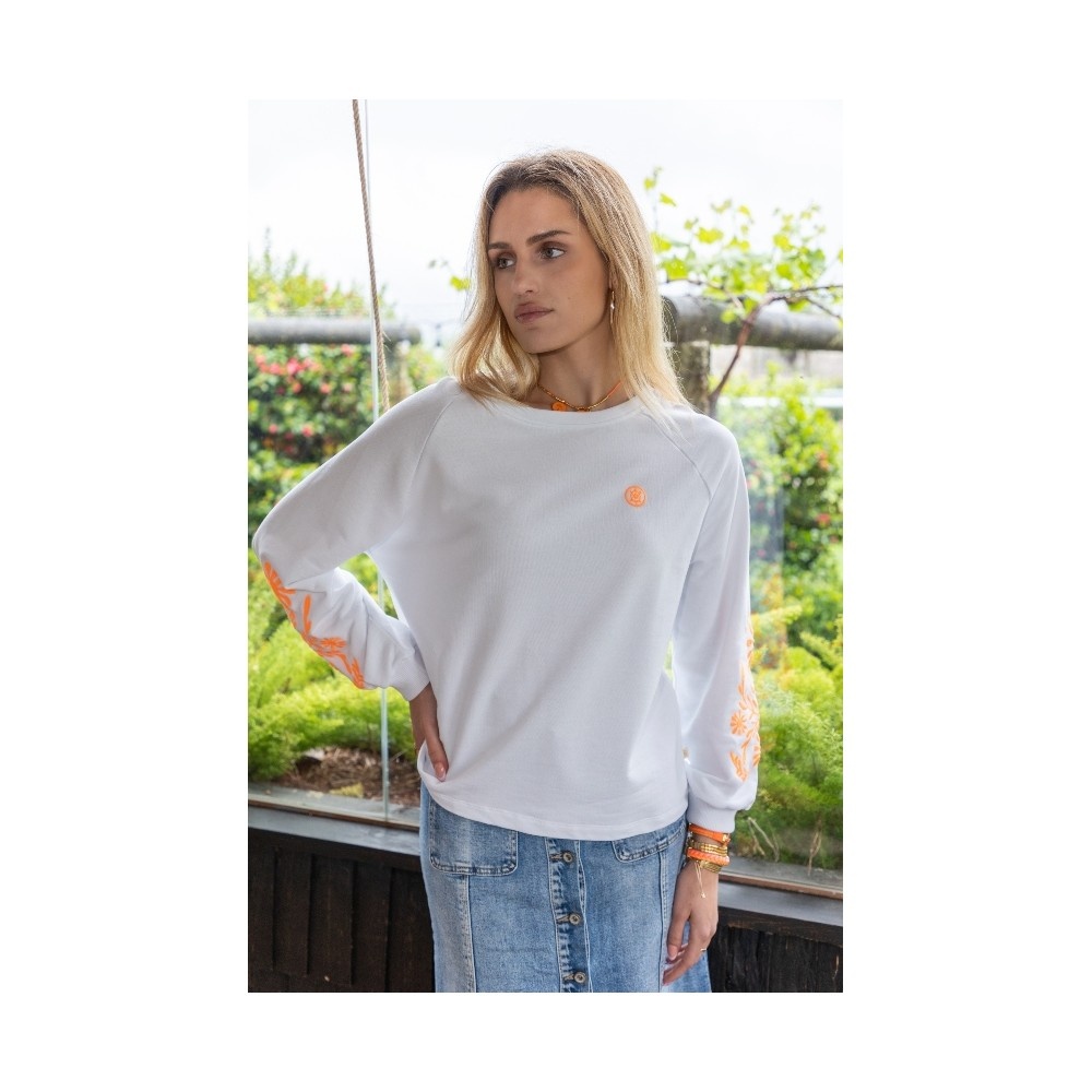 Opvallend door het oranje bloemenborduursel dat contrasteert met het zuiver witte materiaal.