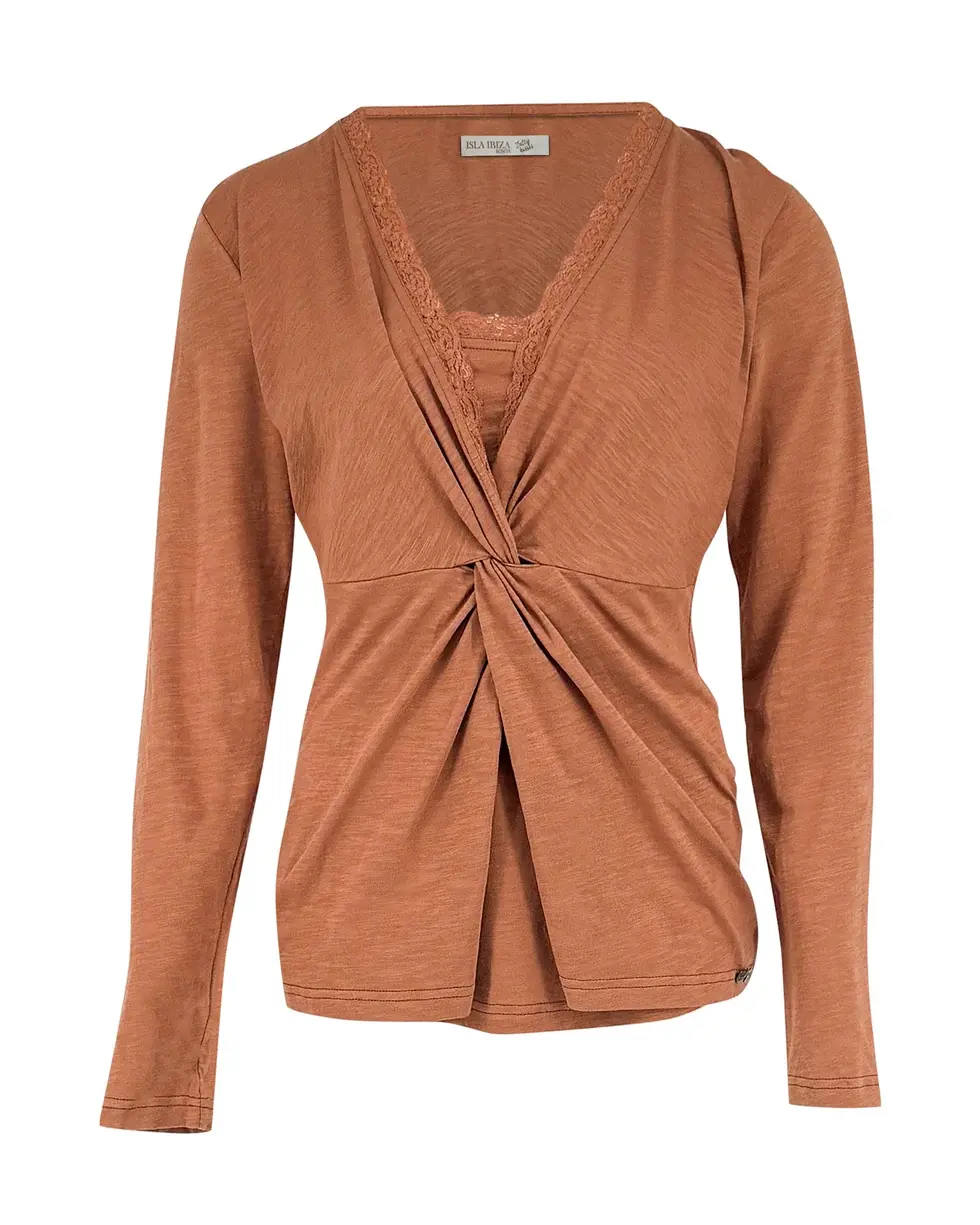 Long sleeve, heeft een V-hals, heeft een gedrapeerde voorkant, loopt aan de onderkant open, heeft een onder top, is bezet met kanten randen.