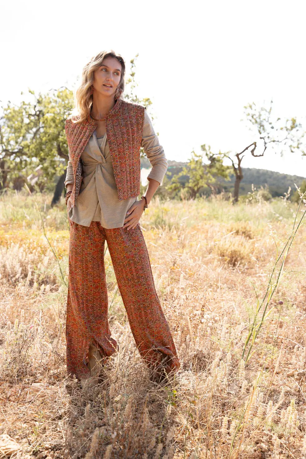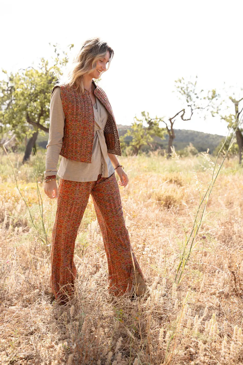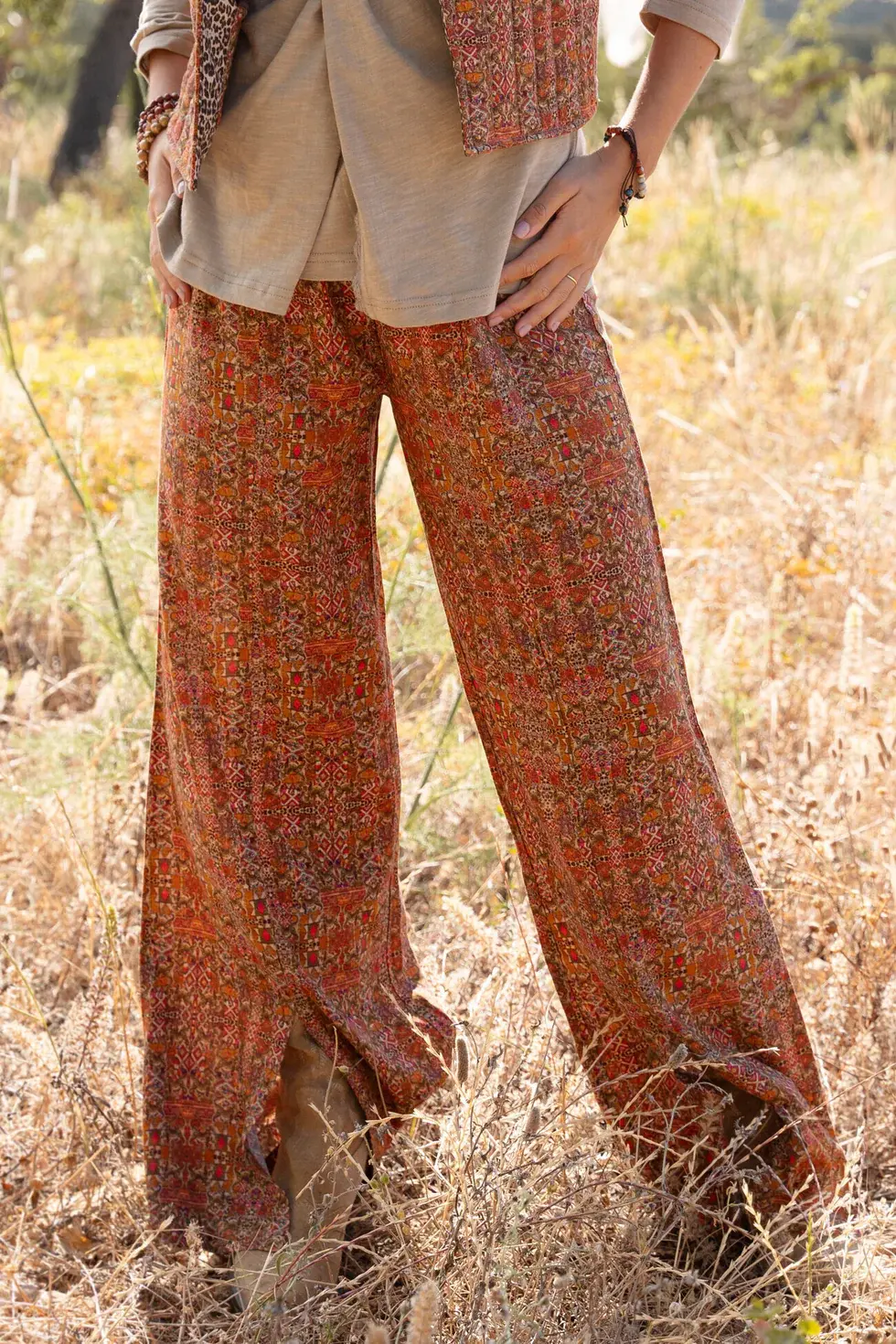 Flared pantalon met print, luchtige en soepel vallende stof, heeft splitten aan de voorkant onderaan de pijpen.